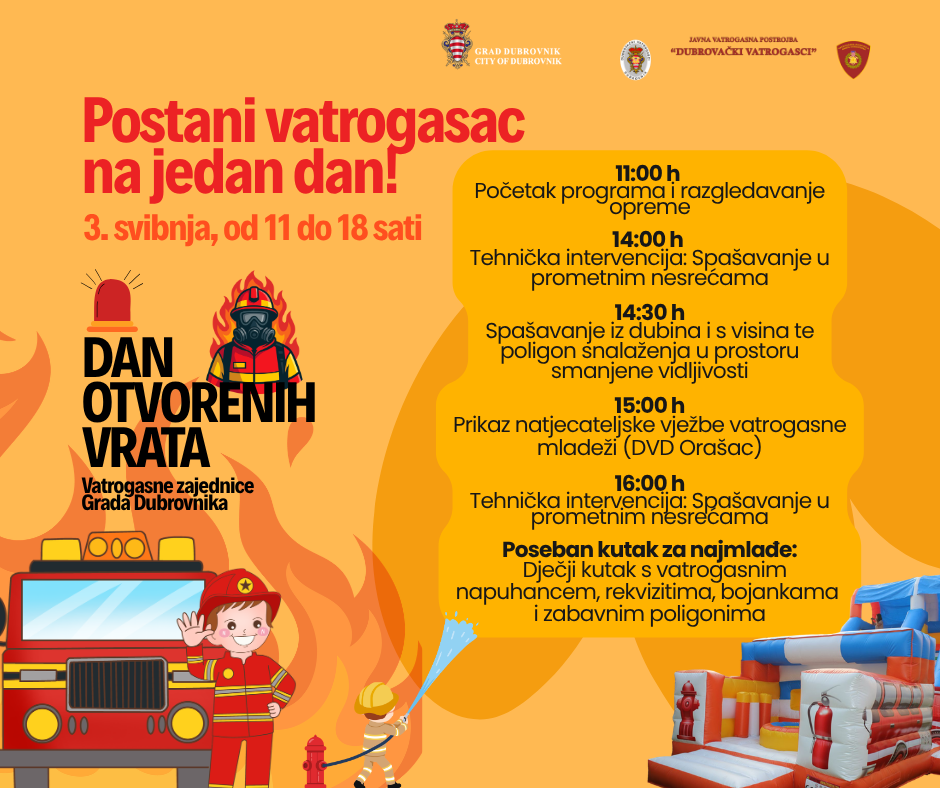 U sklopu obilježavanja blagdana Svetog Florijana, zaštitnika vatrogasaca, Vatrogasna zajednica Grada Dubrovnika po prvi put organizira Dan otvorenih vrata, koji će se održati u nedjelju, 3. svibnja, od 11:00 do 18:00 sati u Luci Dubrovnik (ispod stope Mosta dr. Franja Tuđmana).