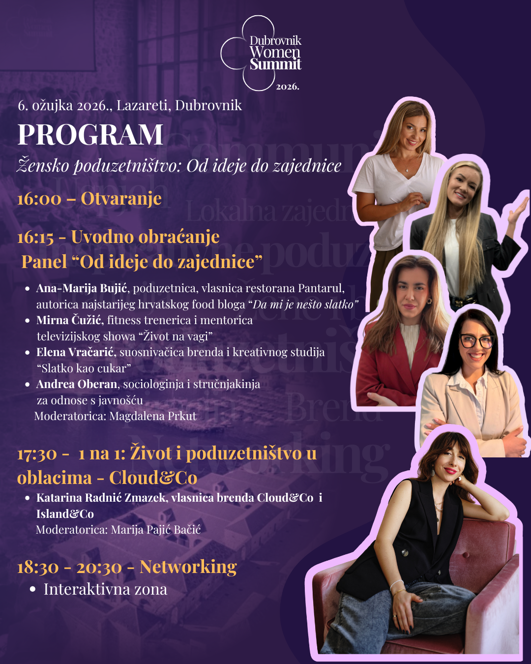 Program započinje zanimljivim panelom u 16:30 sati koji donosi četiri snažne i autentične poduzetničke priče koje potvrđuju koliko je zajednica ključna za rast, vidljivost i dugoročan uspjeh. Ana-Marija Bujić, Elena Vračarić, Mirna Čužić i Andrea Oberan podijelit će svoja iskustva o tome kako se kroz promišljenu i sadržajnu komunikaciju gradi povjerenje, razvija osobni brend i okuplja zajednica koja vas prepoznaje kao relevantan i vjerodostojan glas u svojoj industriji.