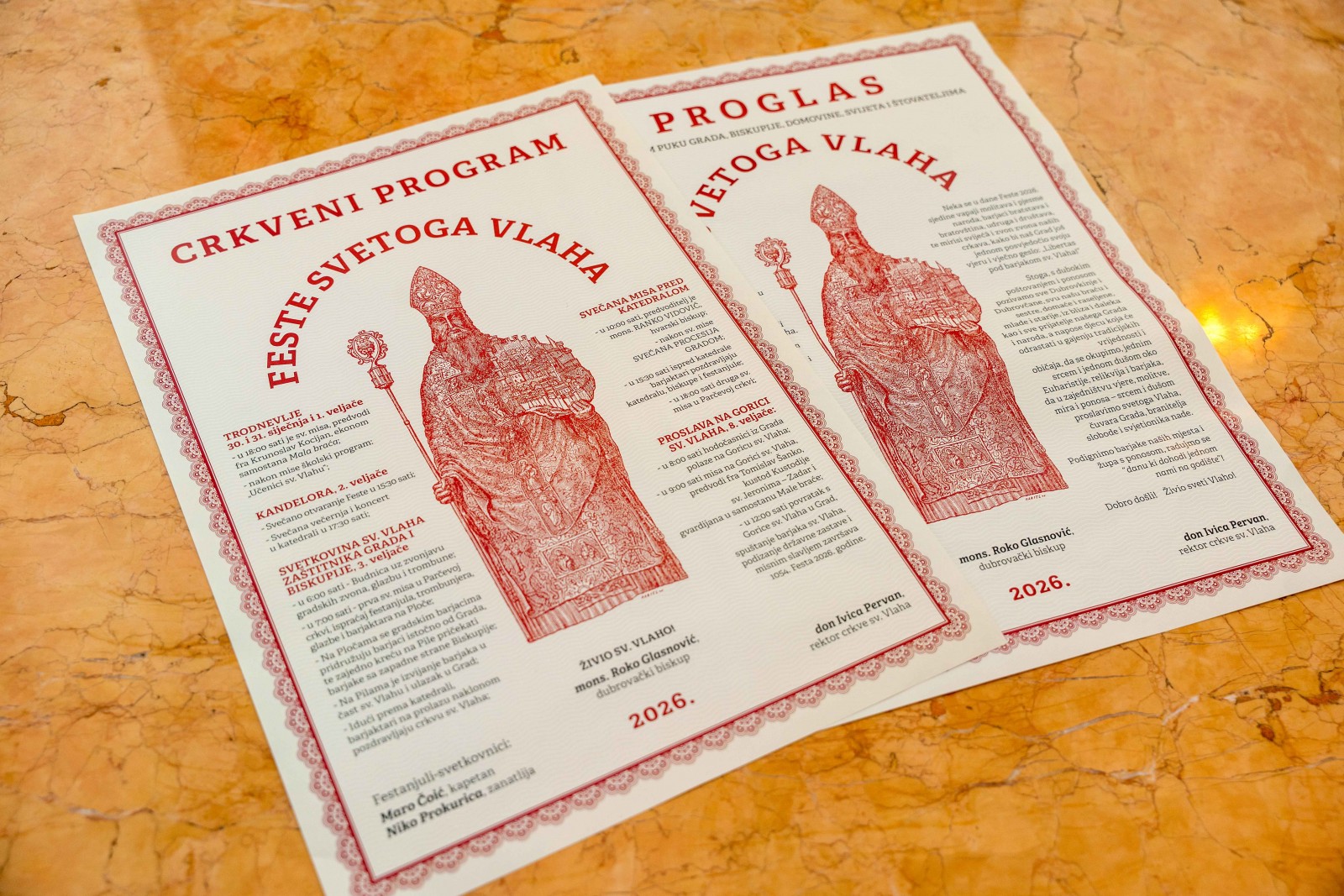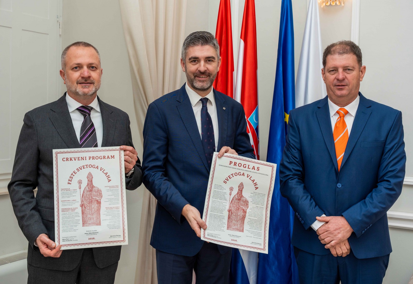 U pratnji rektora crkve sv. Vlaha don Ivice Pervana, festanjuli su gradonačelniku uručili Proglas na kojem stoji zapisano: „Neka se u dane Feste 2026. sjedine vapaji molitava i pjesme naroda, barjaci bratstava i bratovština, udruga i društava, te mirisi svijeća i zvon zvona naših crkava, kako bi naš Grad još jednom posvjedočio svoju vjeru i vječno geslo: „Libertas pod barjakom sv. Vlaha!“