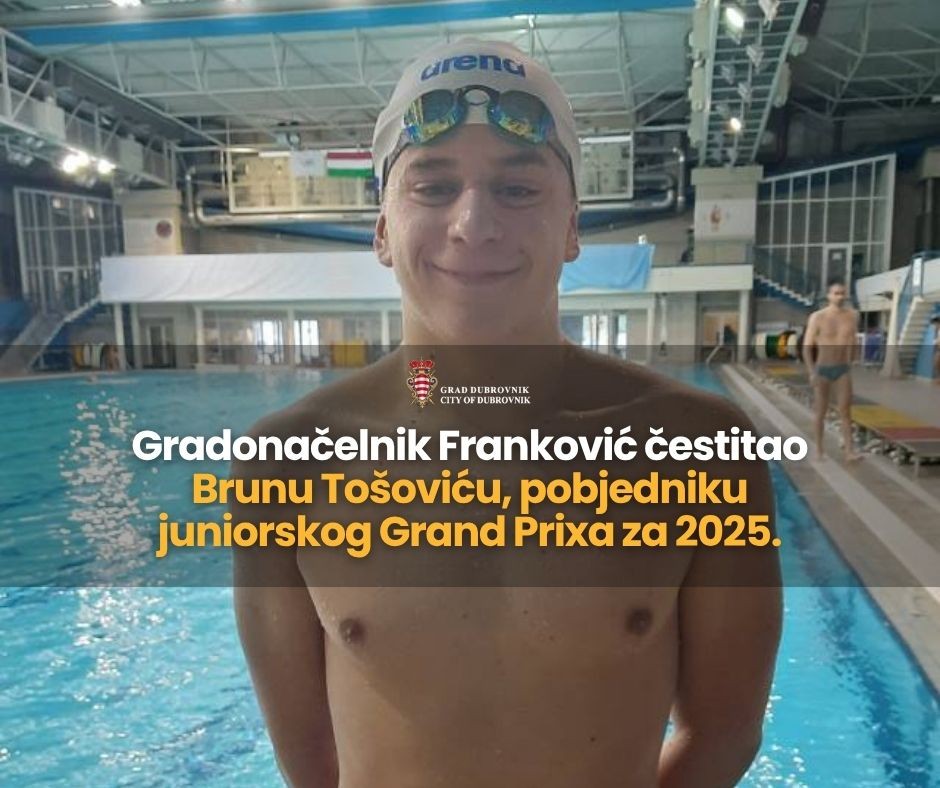 Povodom osvajanja juniorskog Grand Prixa za 2025. godinu., gradonačelnik Mato Franković uputio je čestitku Brunu Tošoviću i Plivačkom klubu Jug. Čestitku prenosimo u cijelosti: