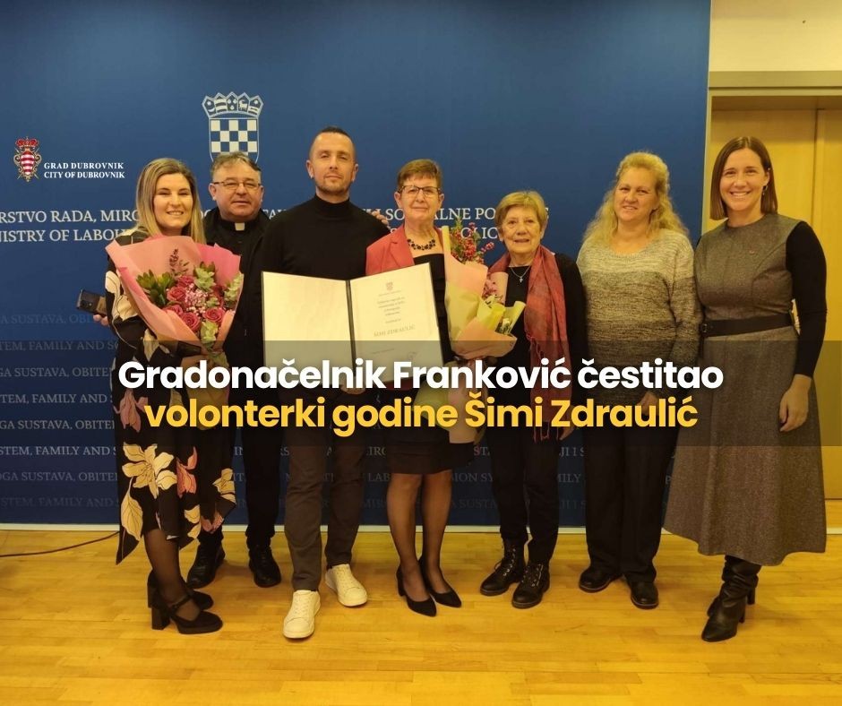 upućujem vam iskrene i srdačne čestitke povodom osvajanja državne nagrade za volontiranje. Vaš dugogodišnji nesebični rad, predanost i istinska empatija prema najpotrebitijima ostavili su dubok trag u našoj zajednici i učinili Dubrovnik boljim mjestom za život.