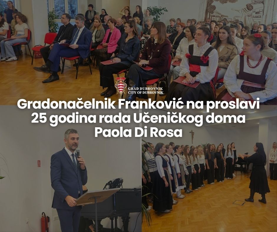 Gradonačelnik Mato Franković sudjelovao je danas na svečanoj proslavi 25 godina rada Učeničkog doma Paola Di Rosa. U svom pozdravnom govoru gradonačelnik čestitao je svima na predanom radu, pritom naglasivši koliko je učenički dom značajan u odgoju učenika jer se stječu brojna znanja i prevladavaju izazovi.