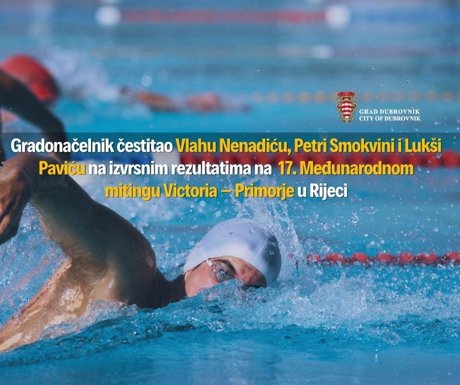 Gradonačelnik Mato Franković uputio je čestitku Vlahu Nenadiću, Petri Smokvini i Lukši Paviću iz Plivačkog kluba Jug na izvrsnim rezultatima na 17. Međunarodnom mitingu Victoria – Primorje u Rijeci. Čestitku prenosimo u cjelosti: