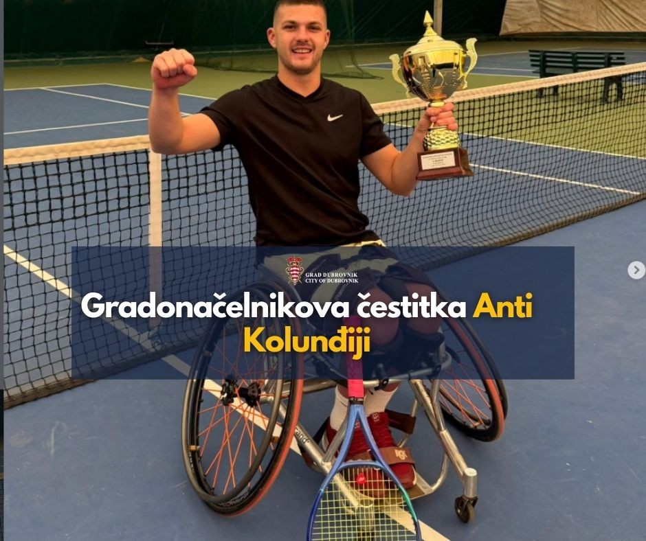 Ante Kolunđija postao je prvi hrvatski reket na svjetskoj rang listi, a proteklog vikenda je osvojio duplu krunu na dvoranskom prvenstvu Hrvatske za tenisače u kolicima. Tim povodom mu je gradonačelnik Mato Franković uputio čestitku koju prenosimo u nastavku: