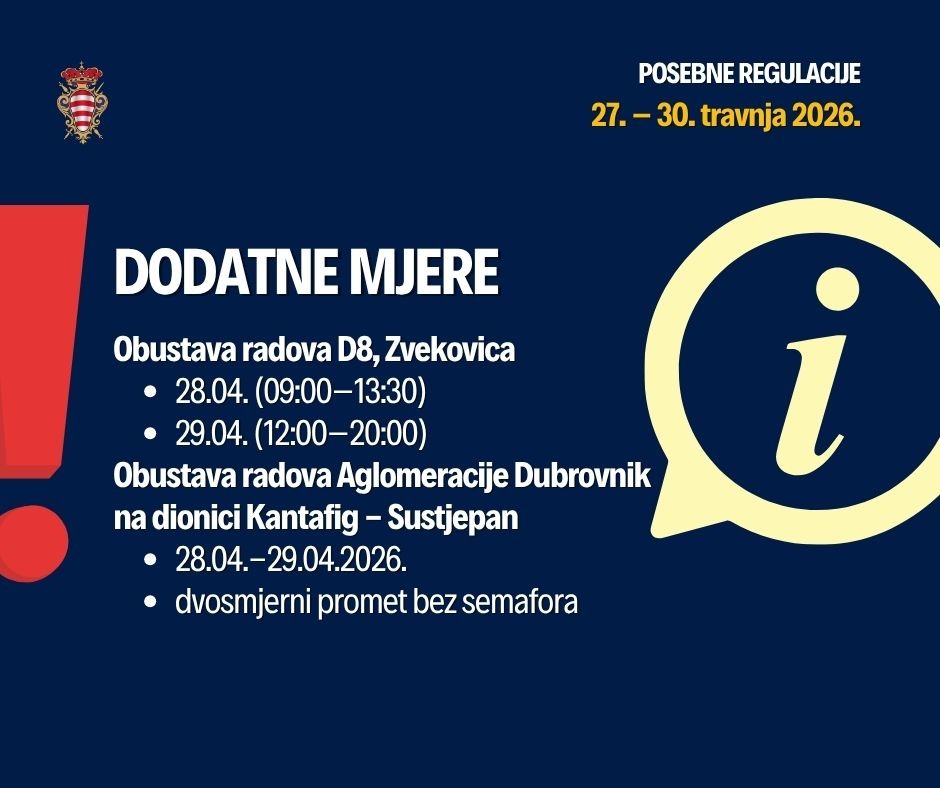 Privremeno će se obustaviti građevinski radovi na izgradnji projekta Aglomeracija Dubrovnik na državnoj cesti D420, od Sustjepana do Kantafiga, 28. i 29. travnja te će se u svrhu nesmetanog prometovanja uspostaviti dvosmjerni promet bez semafora.