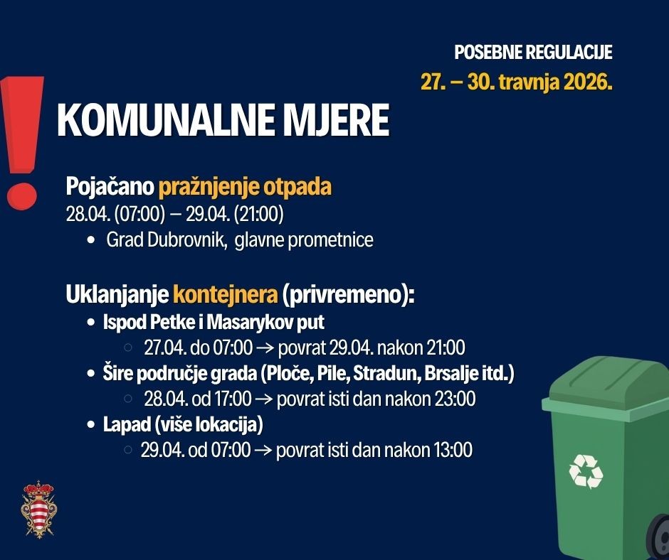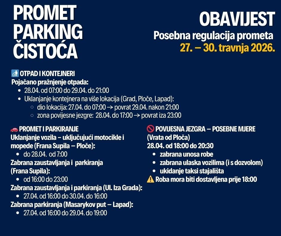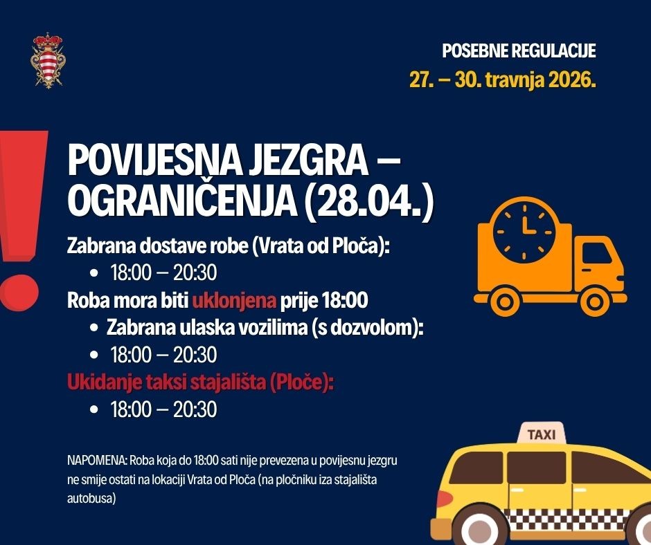 Privremena zabrana prevoženja robe električnim i drugim vozilima u povijesnu jezgru s Ploča, dana 28. travnja od 18 do 20:30 sati. Roba koja do 18 sati nije prevezena u povijesnu jezgru ne smije ostati u području pretovarne zone na Pločama, odnosno na pločniku iza stajališta autobusa.