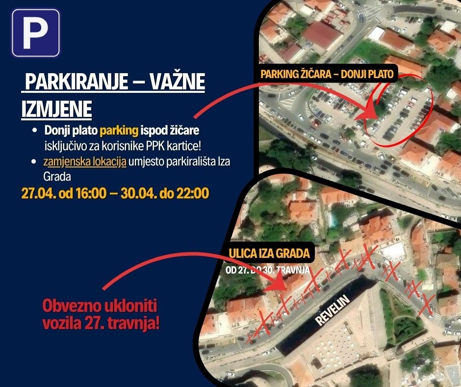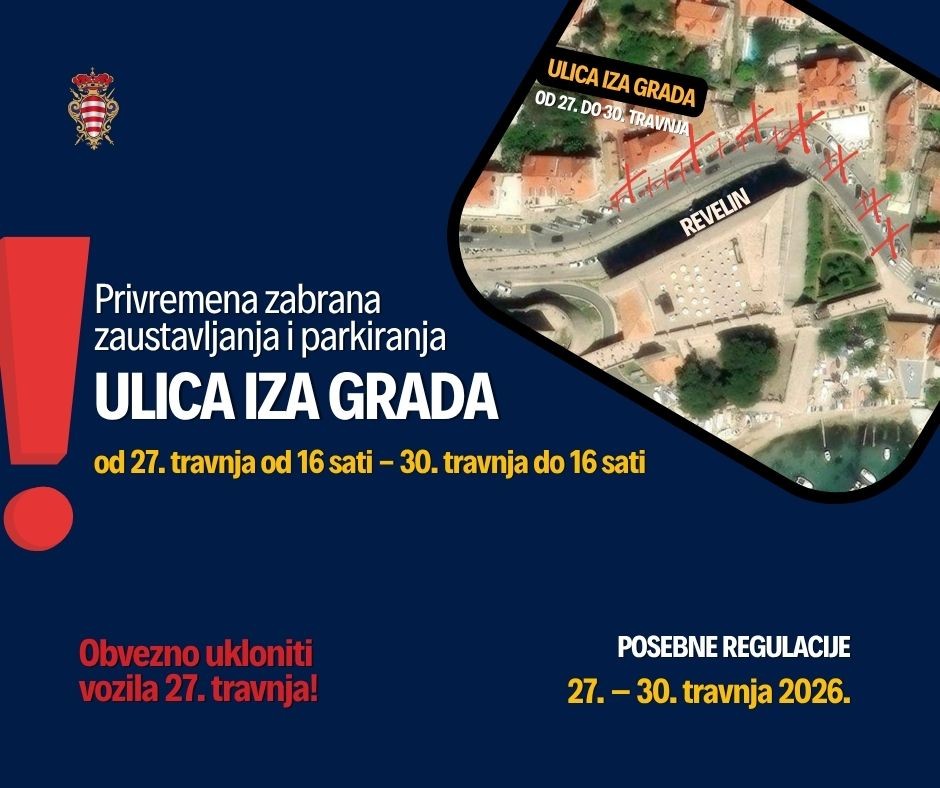 Privremena zabrana parkiranja u ulici Iza Grada od ulaza u povijesnu jezgru na vratima od Ploča do ulaza na parkiralište ispod žičare (parkirališna mjesta desno uz zid), u razdoblju od 27. travnja od 16 sati do 30. travnja do 16 sati.