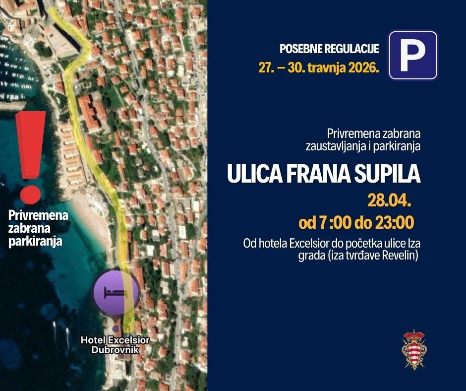 Zabrana parkiranja, uključujući motocikle i mopede, u Ulici Frana Supila od hotela Excelsior do ulaza u povijesnu jezgru na Pločama, dana 28. travnja u razdoblju od 7 do 23 sata. Na istoj dionici ulice bit će na snazi privremena zabrana zaustavljanja od 16 do 23 sata.