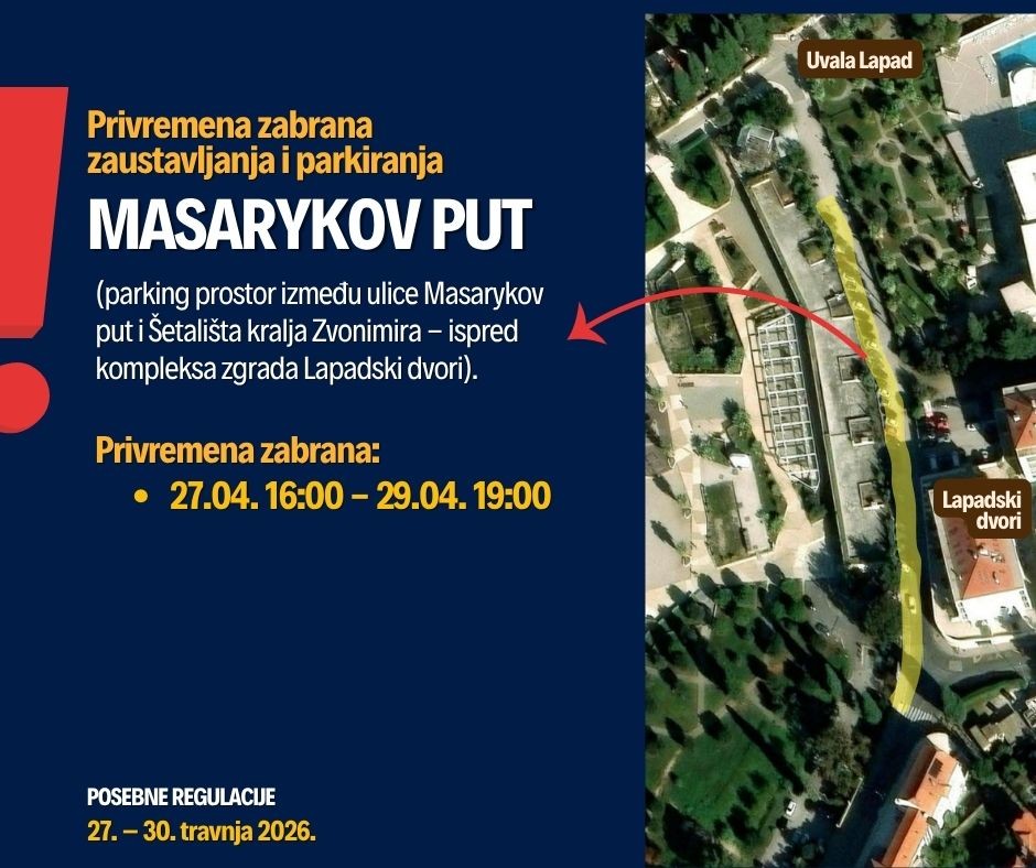 Privremena zabrana zaustavljanja i parkiranja na parkirališnom prostoru u ulici Masarykov put - parking prostor između ulice Masarykov put i Šetališta kralja Zvonimira - ispred kompleksa zgrada Lapadski dvori, u razdoblju od 27. travnja od 16 sati do 29. travnja do 19 sati.