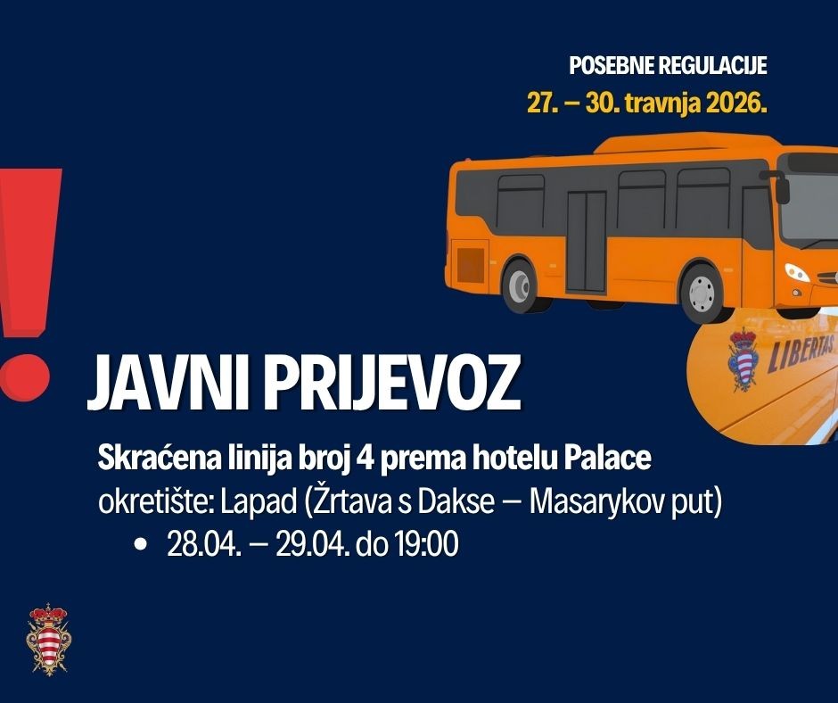 Linija broj 4 JGP Libertas privremeno će prometovati skraćenom trasom i to do raskrižja ulica Žrtava s Dakse - Masarykov put, od jutarnjih sati 28. travnja do 29. travnja do 19 sati.