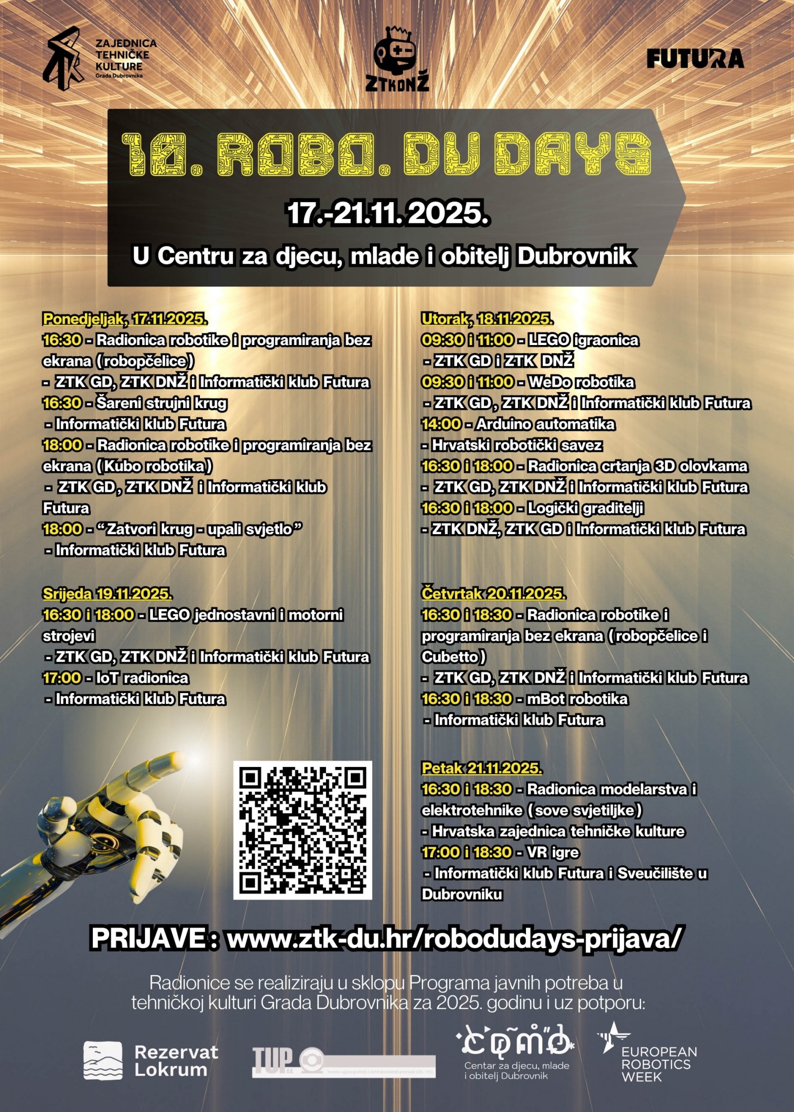 Zajednice tehničke kulture Grada Dubrovnika i Dubrovačko-neretvanske županije u suradnji s Informatičkim klubom Futura organiziraju jubilarno 10. izdanje manifestacije Robo.Du Days, s bogatim programom od čak 24 robotičke radionice u Centru za djecu, mlade i obitelj Dubrovnik od 17. do 21. studenoga 2025. Broj mjesta je ograničen, stoga se potrebno prijaviti putem obrasca: www.ztk-du.hr/robodudays-prijava/.