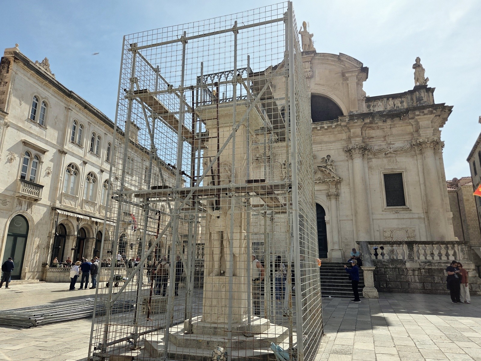 Konzervatorsko-restauratorski radovi Hrvatskog restauratorskog zavoda na Orlandovom stupu ulaze u završnu fazu, a kako bi se postigli optimalni uvjeta osvjetljenja za izvođenje radova toniranja rekonstruiranih dijelova te izvedenih zapuna, sa zaštitne skele uklonjena je postojeća obloga s informativnim platnom.