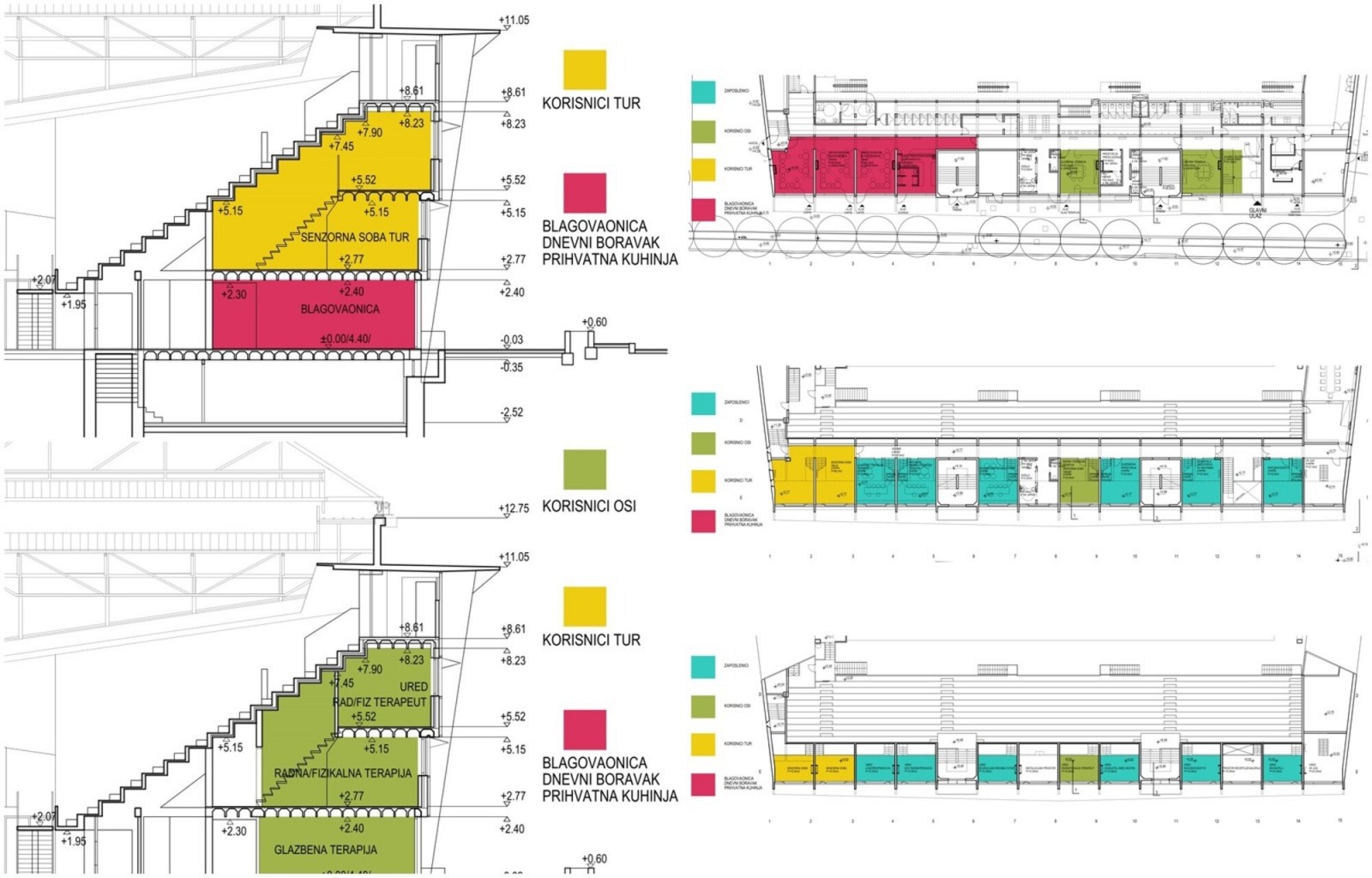 Na katu su smješteni prostori za senzornu terapiju i prostori za individualnu terapiju: psiholog, sociolog, radni terapeut i slično. Također, na katu su smješteni i prostori za zaposlenike odnosno prostor za sastanke zaposlenika. Galerijski prostori su predviđeni za uredski rad zaposlenika i razne pomoćne prostore zbog njihove slabije dostupnosti.