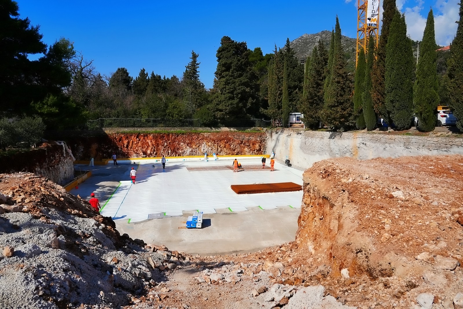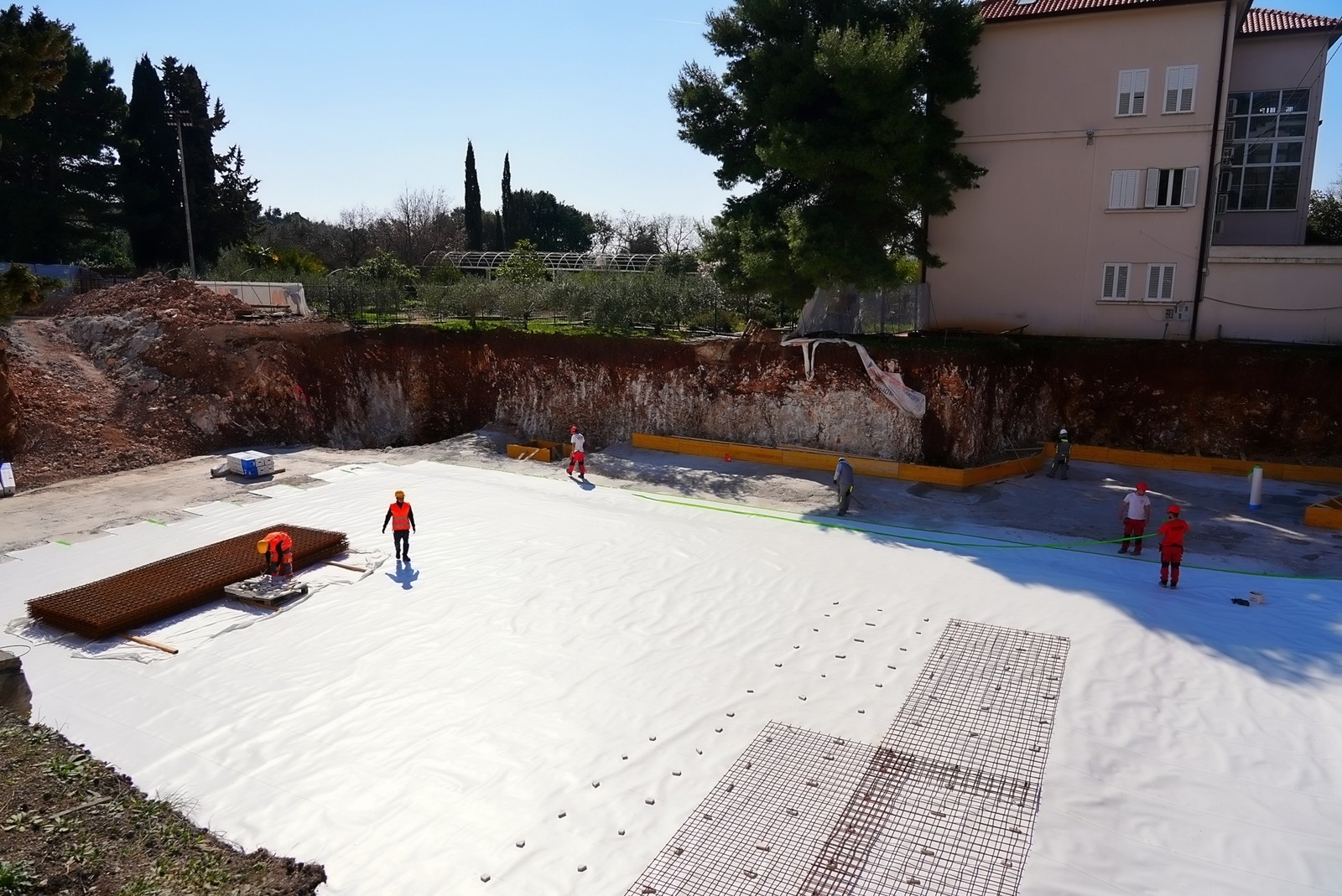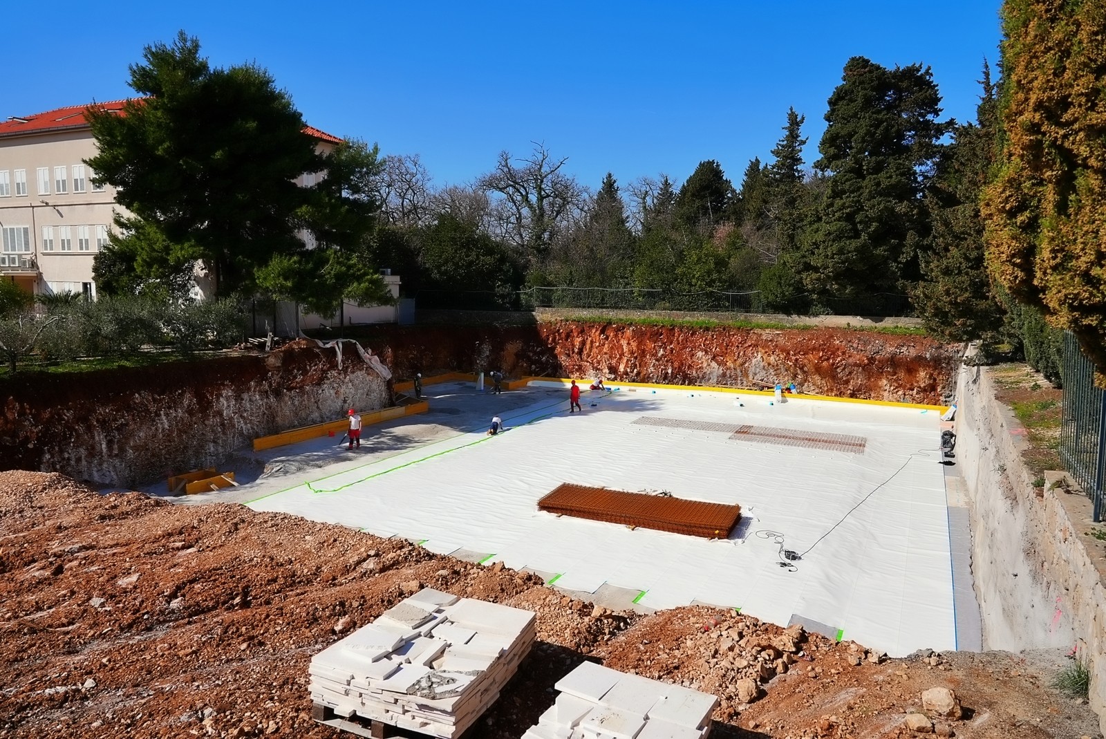 Nakon pripreme i osiguranja građevinske jame, na već izvedeni podložni beton postavlja se hidroizolacija. Započeli su radovi armiranja temeljne ploče dvorane, a slijedi betoniranje temeljne ploče te nastavak radova na konstrukciji dvorane. Radove izvodi tvrtka Texo Molior uz stručni nadzor koji provodi tvrtka Deltagrad.