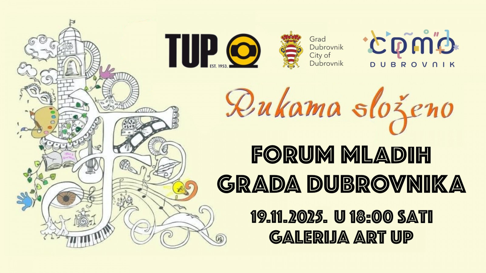 Organizator događanja je Centar za djecu, mlade i obitelj Dubrovnik, koji djeluje pod nadležnošću Upravnog odjela za obrazovanje, šport, socijalnu skrb i civilno društvo Grada Dubrovnika, uz potporu TUP d.d. Izložba učeničkih radova održat će se 19. studenoga s početkom u 18:00 sati u galeriji ART UP, smještenoj u dvorištu upravne zgrade TUP-a – prostoru koji posljednjih mjeseci postaje prepoznatljivo mjesto susreta kulture i umjetnosti.