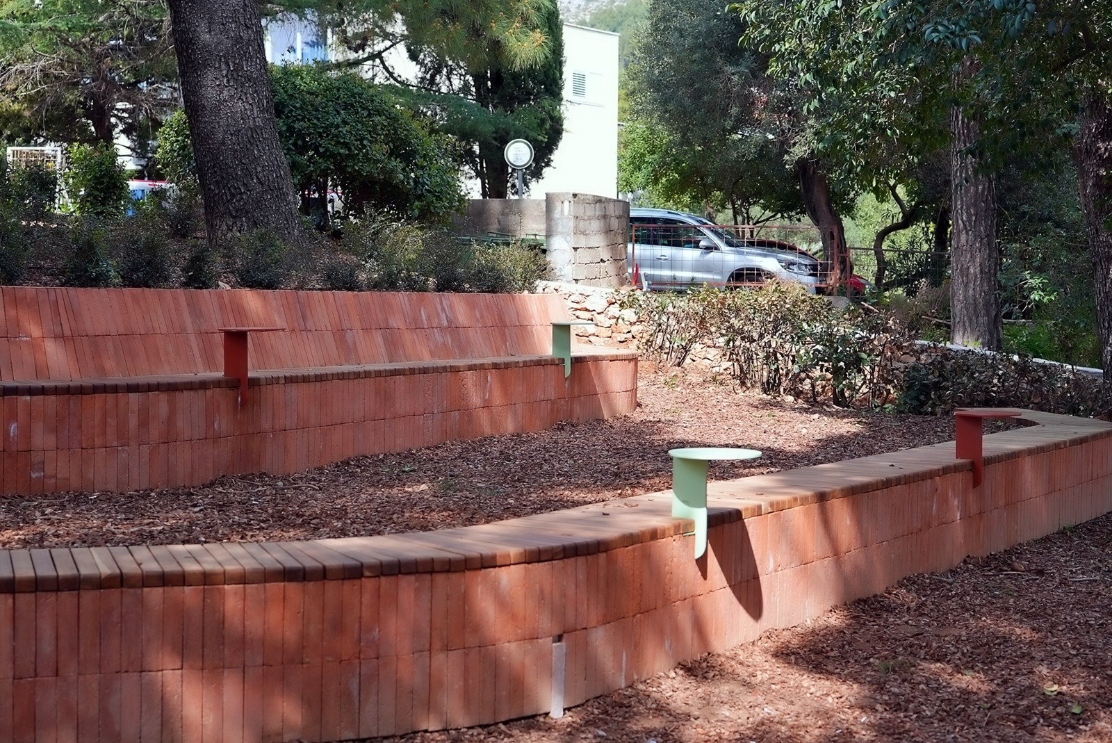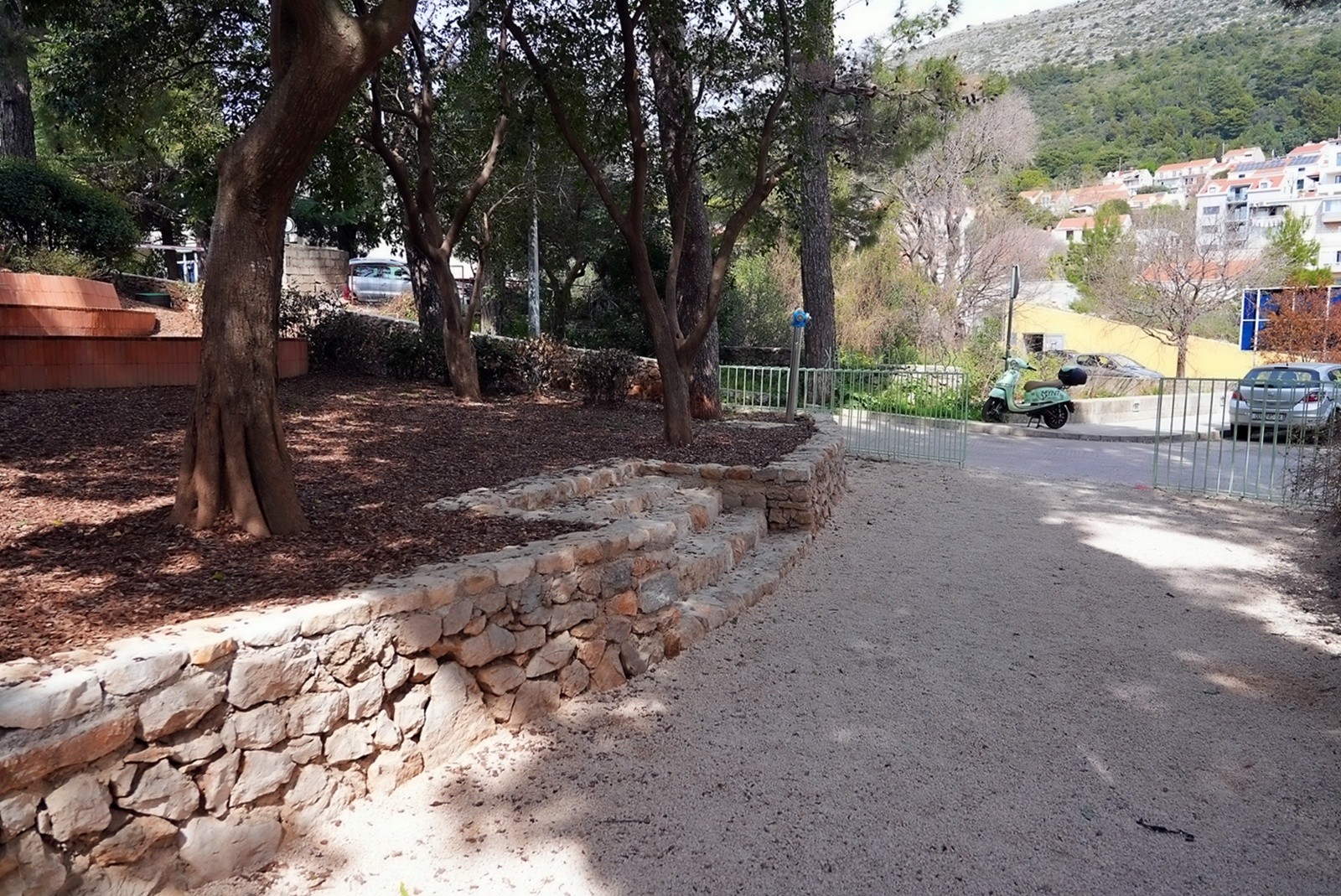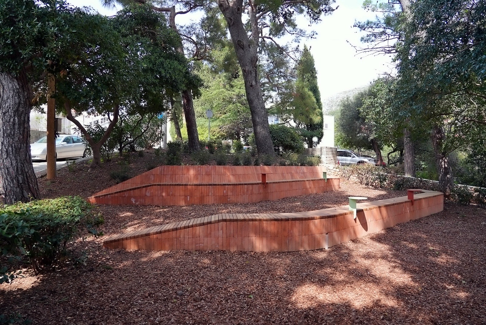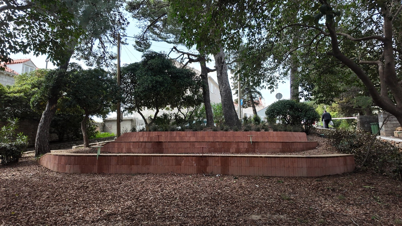 Prostor je oblikovan kao zona boravka na otvorenom, s naglaskom na sigurnost, funkcionalnost i ugodan ambijent. Prema cesti je povišen postojeći kameni zid čime se postigla jasna granica prostora i povećana sigurnost korisnika, a pristup zelenoj površini omogućen je preko dva stepeništa. Na zelenoj površini formirane su dvije građevne klupe od betona koje istodobno i nose zemljanu padinu. Klupe su obložene tavelama, a sjedeće plohe su izvedene od drvenih letvica - jedna s naslonom, a druga bez. Uz klupe su postavljeni posebno oblikovani stolići. Kao dodatna atrakcija u prostoru je, između postojećih stabala, formirana zona ležernog odmora.