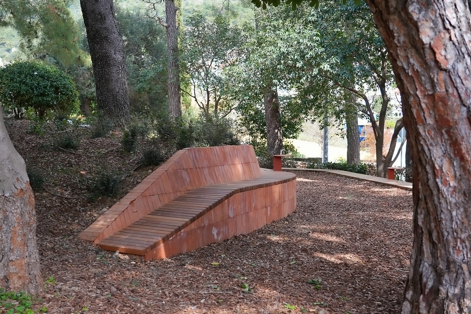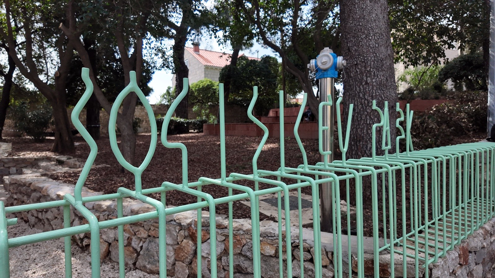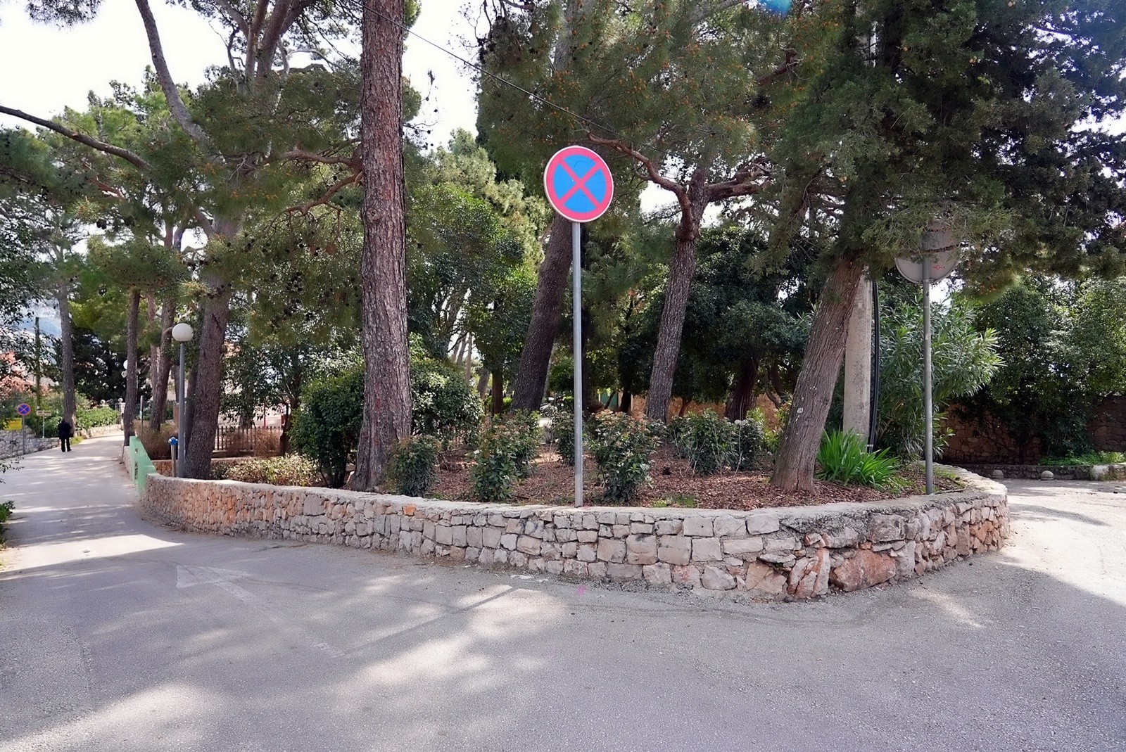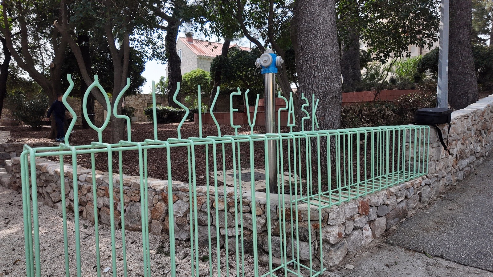 Prostor je oblikovan kao zona boravka na otvorenom, s naglaskom na sigurnost, funkcionalnost i ugodan ambijent. Prema cesti je povišen postojeći kameni zid čime se postigla jasna granica prostora i povećana sigurnost korisnika, a pristup zelenoj površini omogućen je preko dva stepeništa. Na zelenoj površini formirane su dvije građevne klupe od betona koje istodobno i nose zemljanu padinu. Klupe su obložene tavelama, a sjedeće plohe su izvedene od drvenih letvica - jedna s naslonom, a druga bez. Uz klupe su postavljeni posebno oblikovani stolići. Kao dodatna atrakcija u prostoru je, između postojećih stabala, formirana zona ležernog odmora.