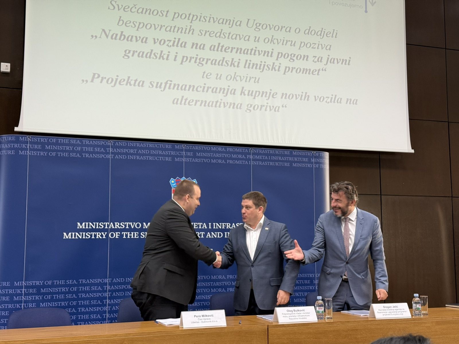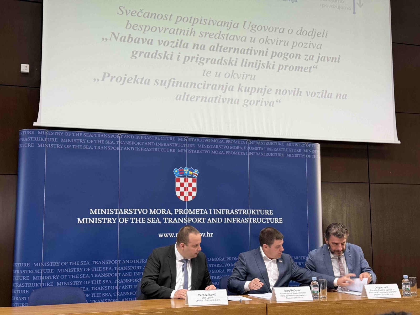 Ugovor za projekt „Elektrifikacija javnog autobusnog prijevoza“, putem kojeg će Libertas Dubrovnik nabaviti 12 novih električnih autobusa, potpisali su danas u Zagrebu potpredsjednik Vlade i ministar mora, prometa i infrastrukture Oleg Butković, ravnatelj Središnje agencije za financiranje i ugovaranje programa i projekata Europske unije (SAFU) Dragan Jelić i direktor Libertasa Pero Milković.