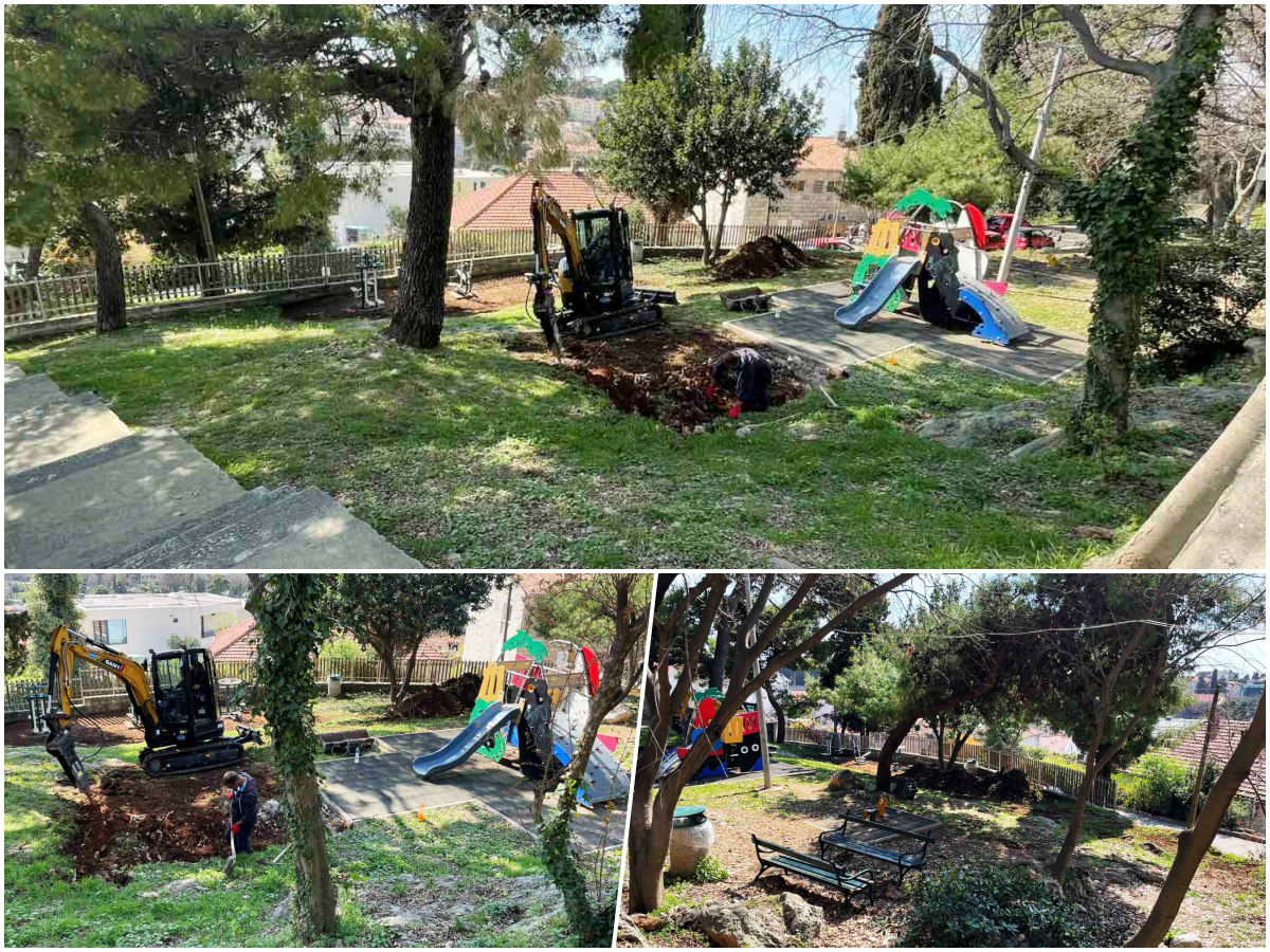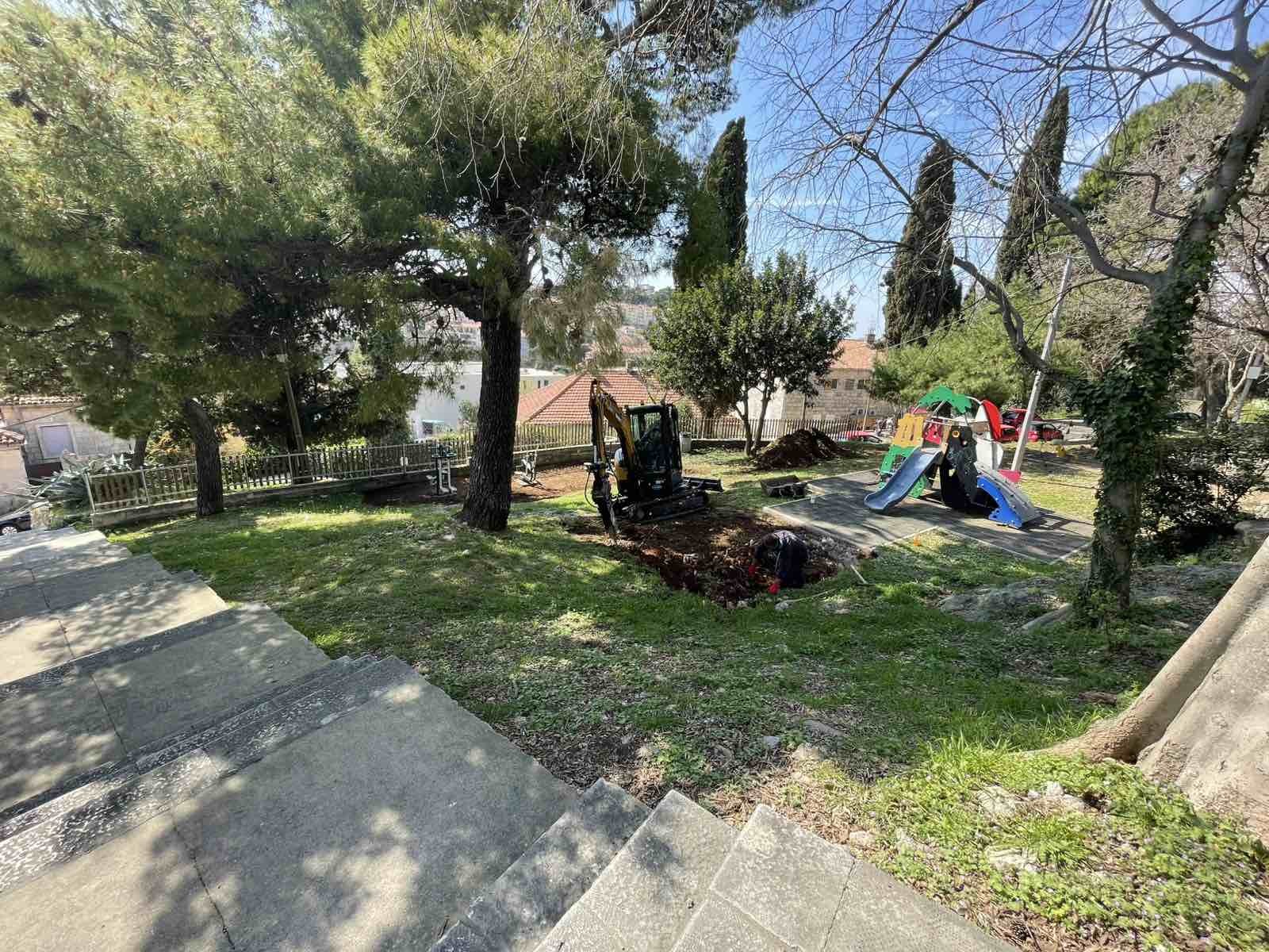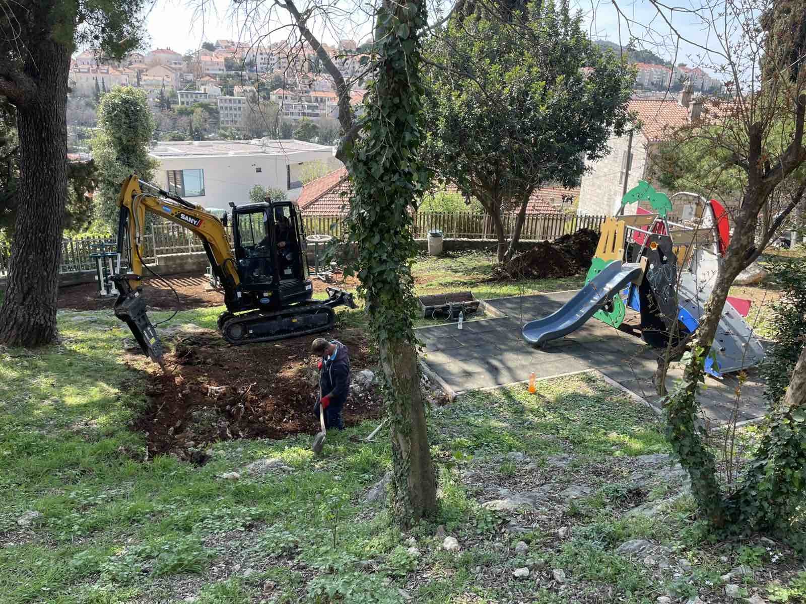 Radove izvodi tvrtka ATIS Dubrovnik, a obuhvaćaju izradu manjeg zaštitnog zida kako bi se spriječio prodor oborinskih voda na podlogu dječjih sprava te proširenje gumenih podloga oko postojećih sprava radi dodatne sigurnosti. Također, uklanja se oštećena antistres gumirana podloga i postavlja nova.